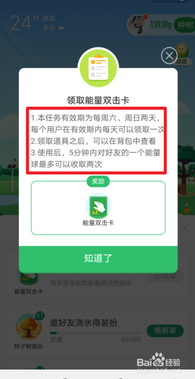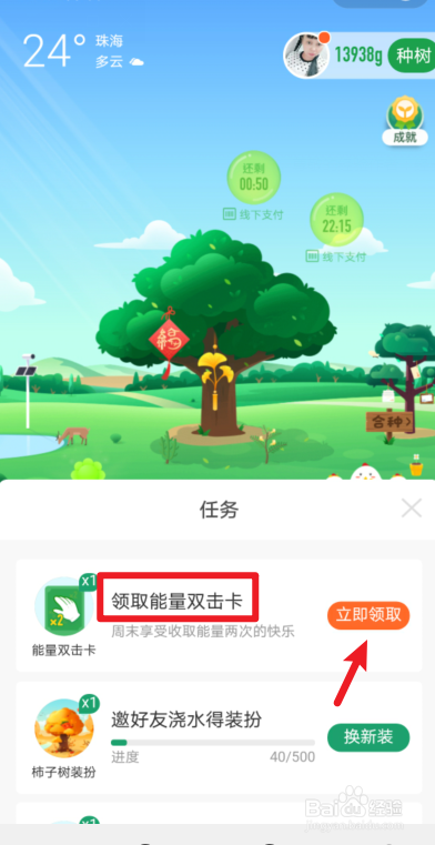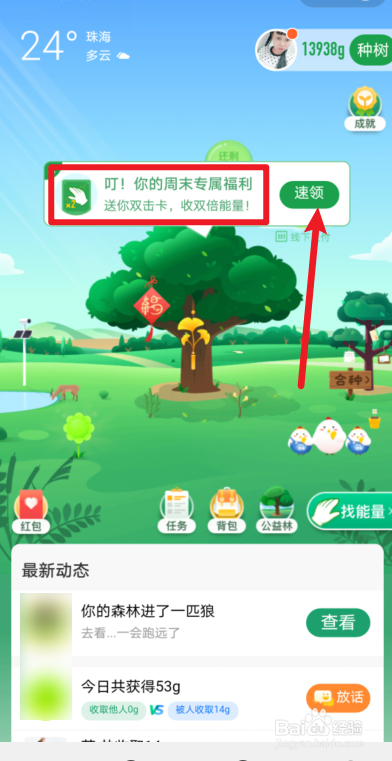 进入蚂蚁丛林后,看到您的树上有提醒:您的周末扬仗专属福利,送您双击能量卡,本来双击能量卡是周末的福利。