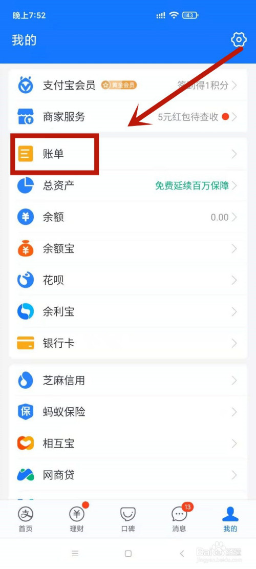 在我的页面,点击进入账单选项。