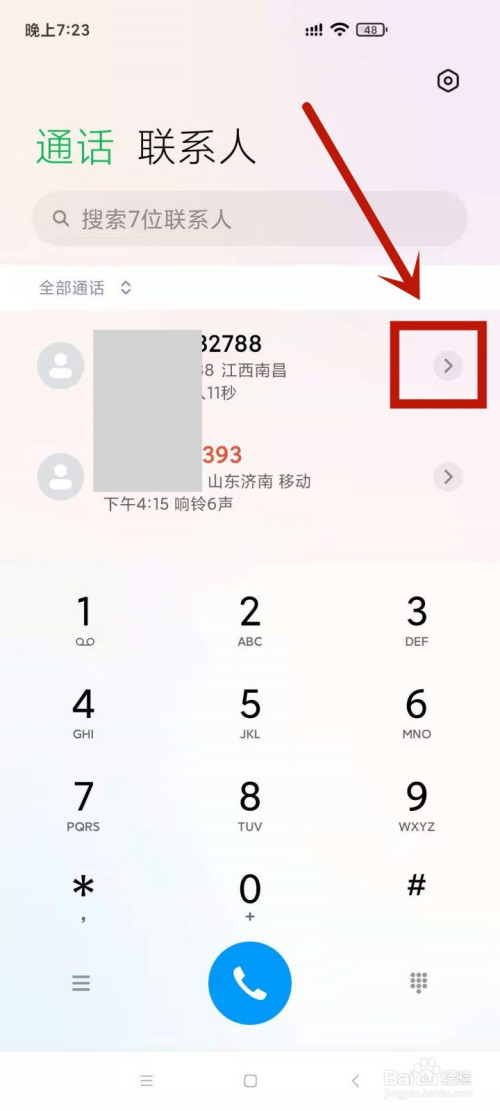 1.打开德律风,找到某一通话记实后,点击该记实后的小箭头。