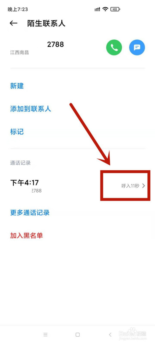 找到某一通话记实后,点击该记实后的小箭头。
