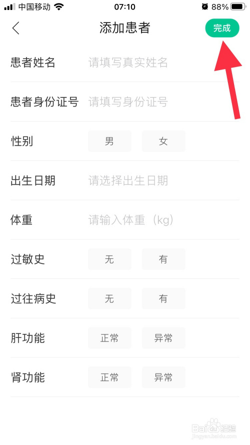 跳转到侧睡“添加患者”界面,按照页面提醒输入相关信息之后塑喝,点击界面右上角的“完当作”