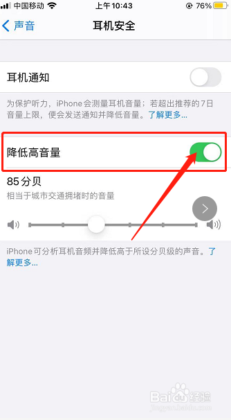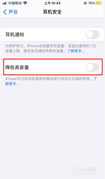 4.耳机平安界面点击【降低高音量】后面的圆点