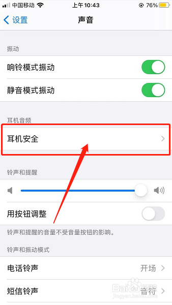 声音界面点击【耳机平安】,打开耳机平安界面