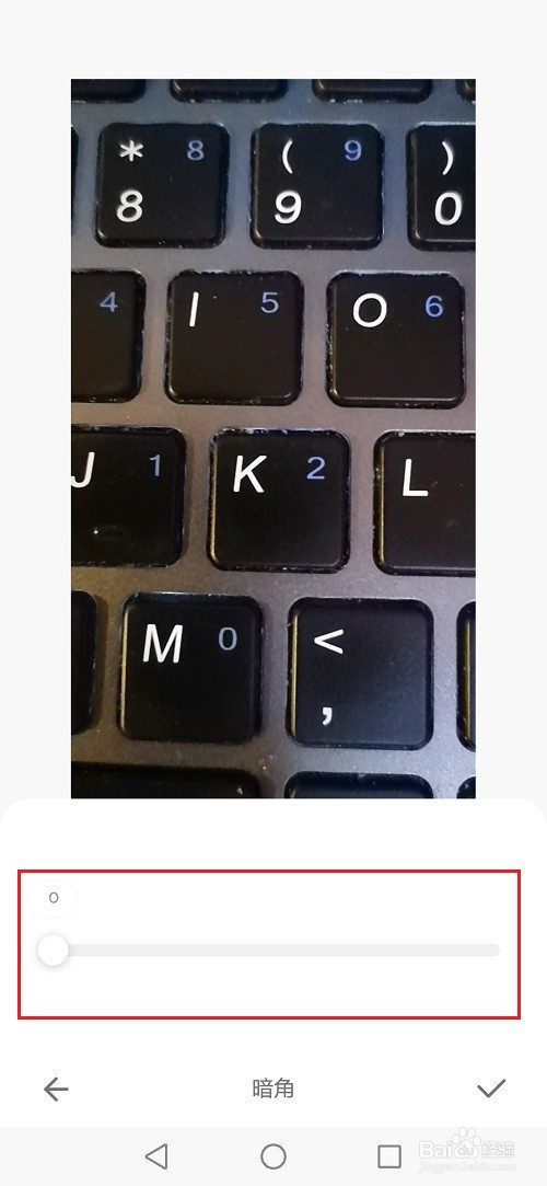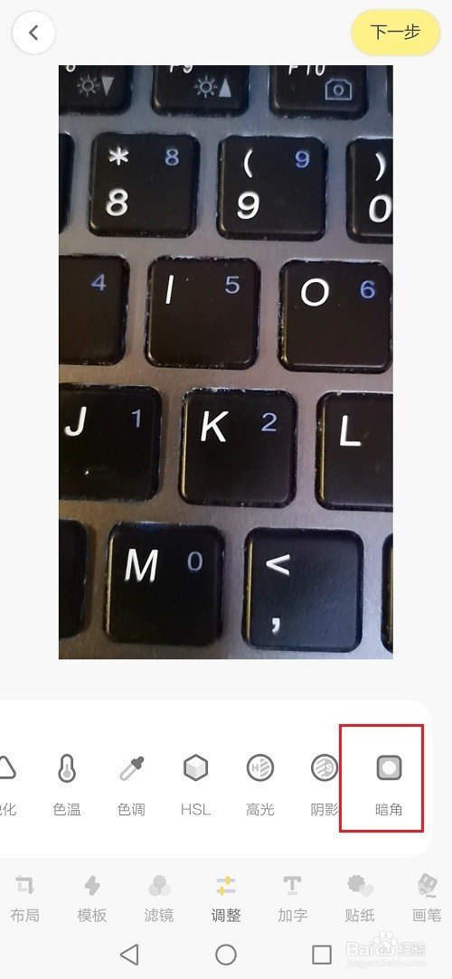 第四步进去之后,点击底部的调整,选择暗角