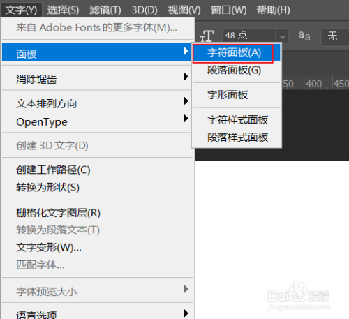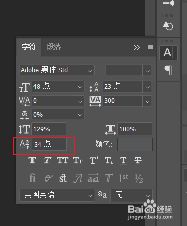 总结:点击东西栏的文字东西并输入文字,然后选中文字图层的TM并点击文字菜激芬单栏的字符面板,最后设置基盲蚂线偏移的参数为34
