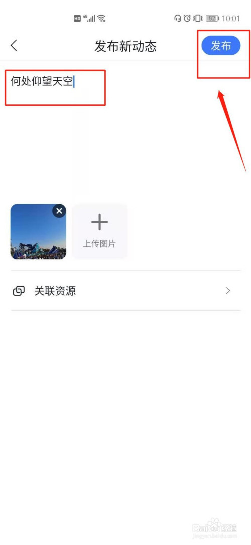 4.然后上传手机图片照片,输入话题内容。选择“发布”。