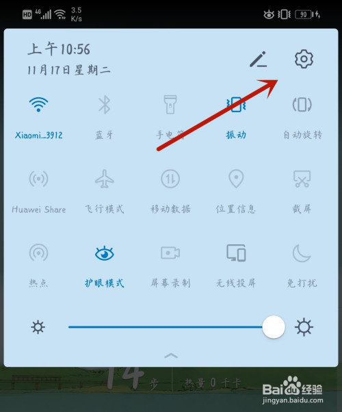 首先下拉手机通知栏,点击设置图标。