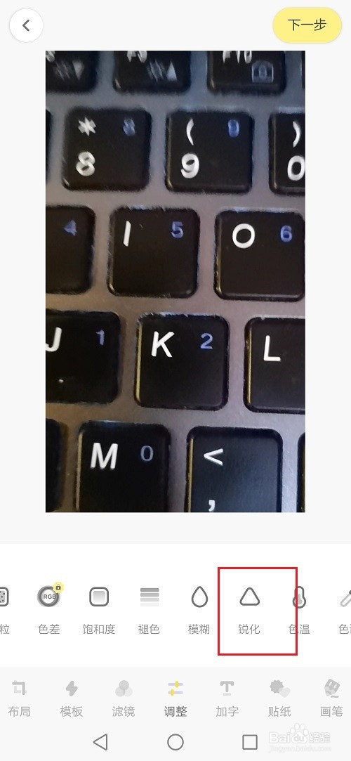 第四步进去之后,点击底部的调整,然后点王特击锐化