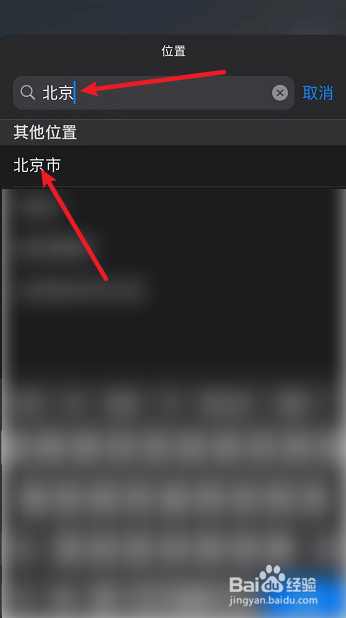 位置界面搜刮想要设置的城市,选择匹配项,例如海说神聊京
