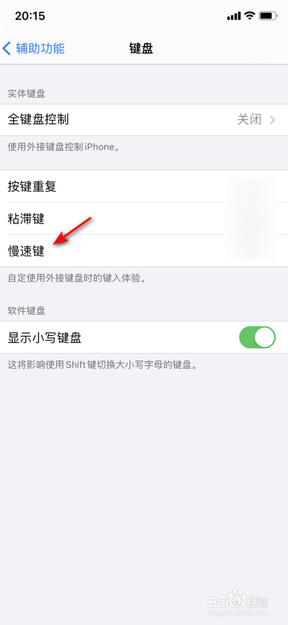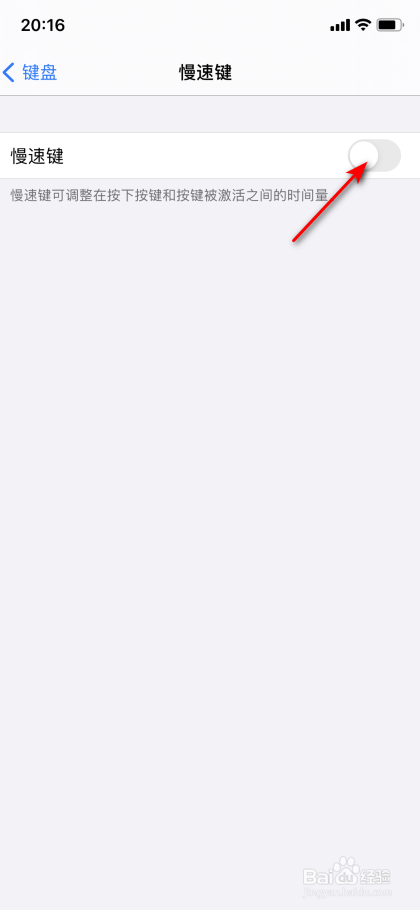 然后将慢速键的滑动按钮标的目的左滑动封闭。这样就可以解决打字卡顿延迟的问题了。