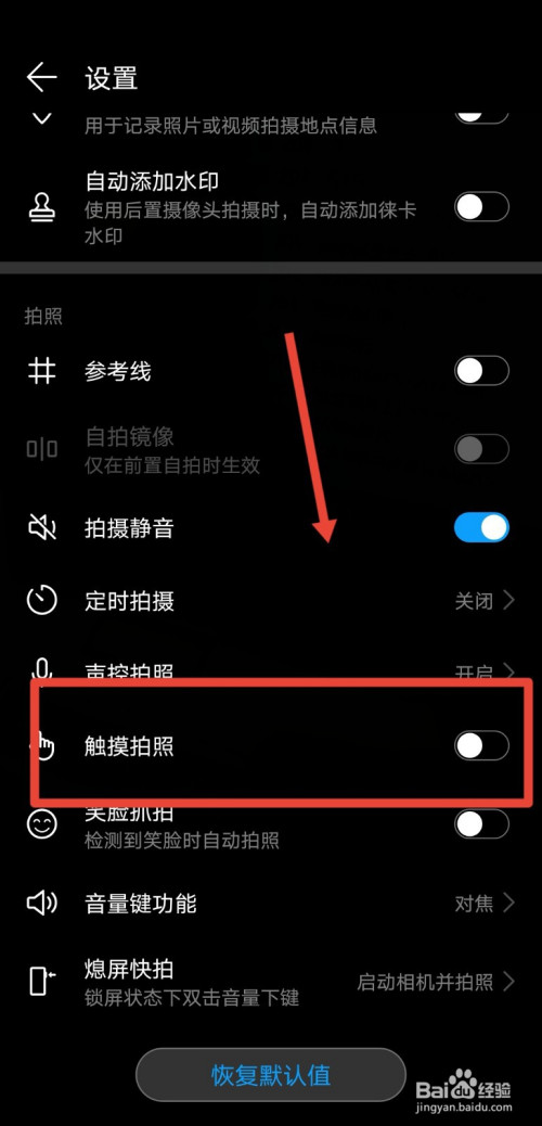 进入到设置功能裕败页面后,找到触摸摄影功能,我们可以看到,该功能是封闭的;