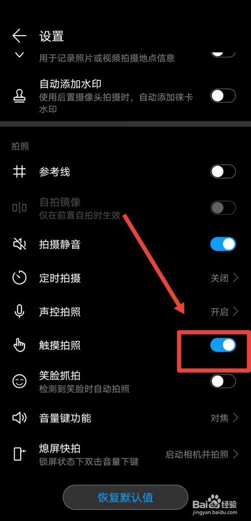 我们将触摸摄影功能后的灰色按钮,设置为蓝色后,即可开启该功能;