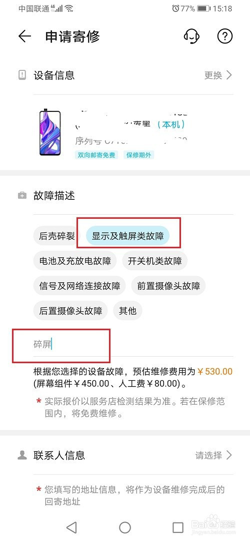 第五步进去之后,选择显示及触屏何召称类故障,输入碎沫艺屏,点击提交,就可以将碎屏的手机寄修出去了,按照需要利用