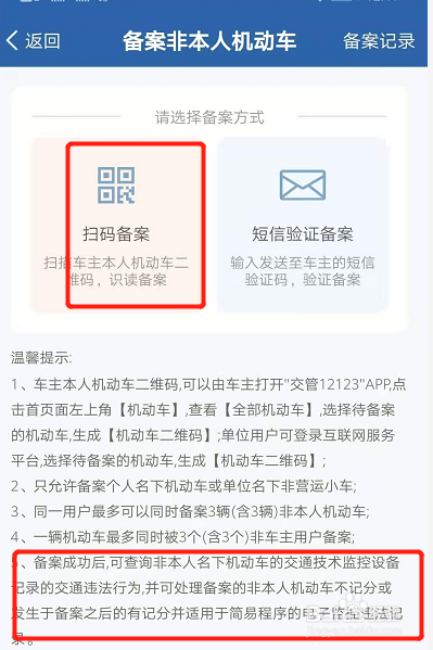 在存案页面,点击扫码存案,下方提醒可以处置存案的非本人灵活车不记分或者积分的违章记实。
