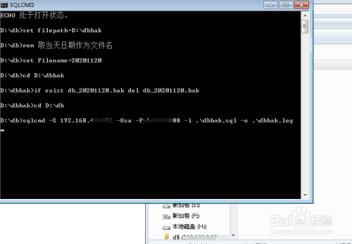 sqlcmd -S 192.168.100.100 -Usa -Ptest123 -i .\dbbak.sql -o .\dbbak.log