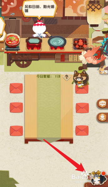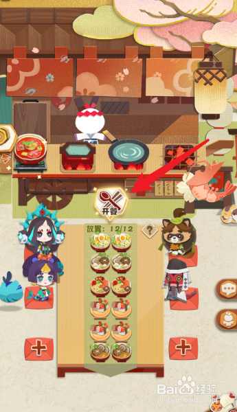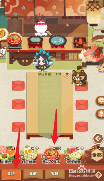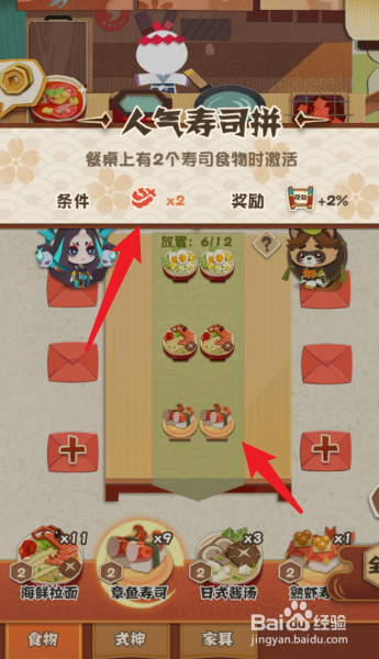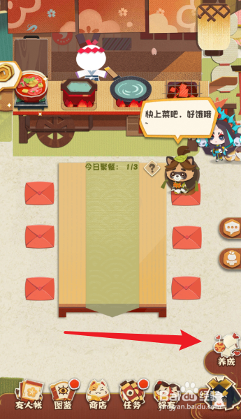 5、最后,将食物摆到桌子上,再点击开餐即可。摆的食物的种类越多结果越多,式神获得经验也就越多。
