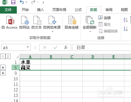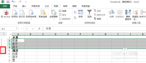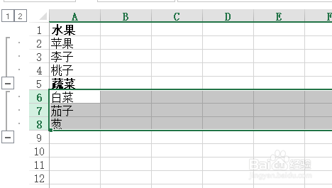同理再选中帮菌所有属于【蔬菜】的品种地点的行,再依次点击【数据】->【建立组】->【建立组(G)】,这时在行号栏左侧又多出了一个带“-”的方框,如下图所示。