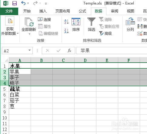 先选中所有属于【生果】的品种地点的行,如下图中所示。