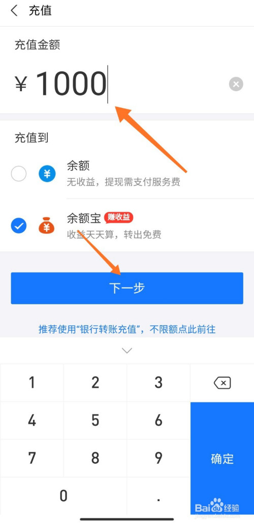 在充值页面中,输入金额,点击下一步;