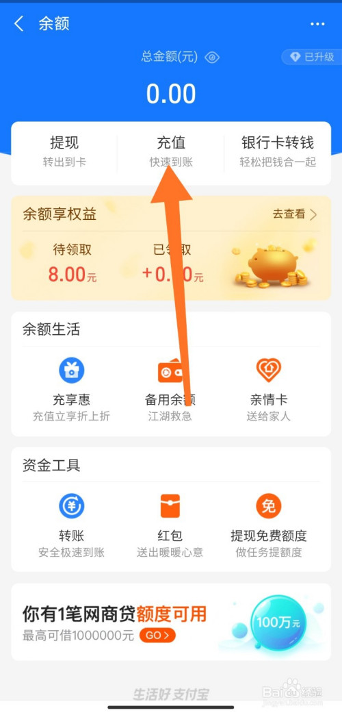 在余额页面,点击充值;