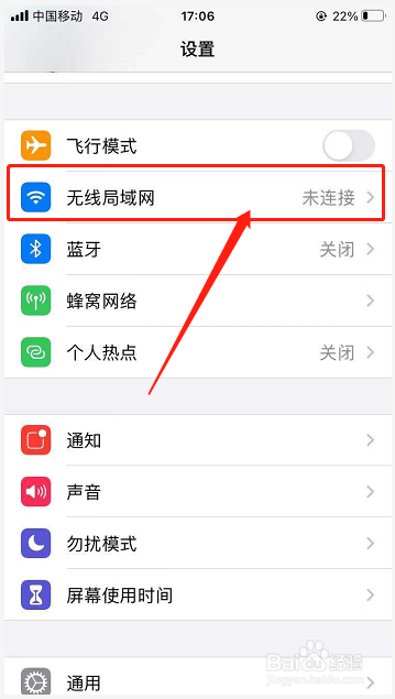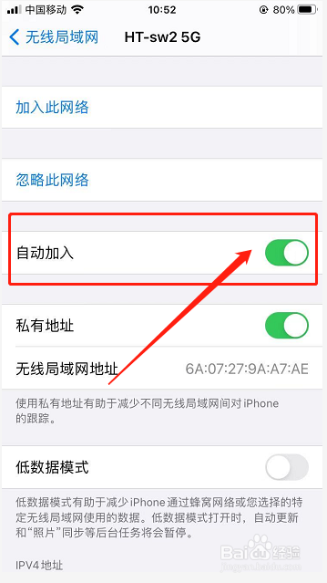 4.无线收集界面点击【主动进入】后面的圆点,圆点变为灰色即暗示iPhone封闭主动插手无线局域网当作功