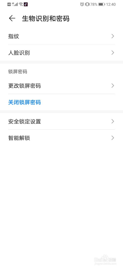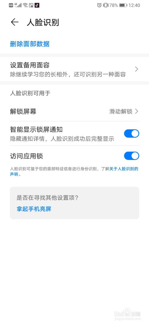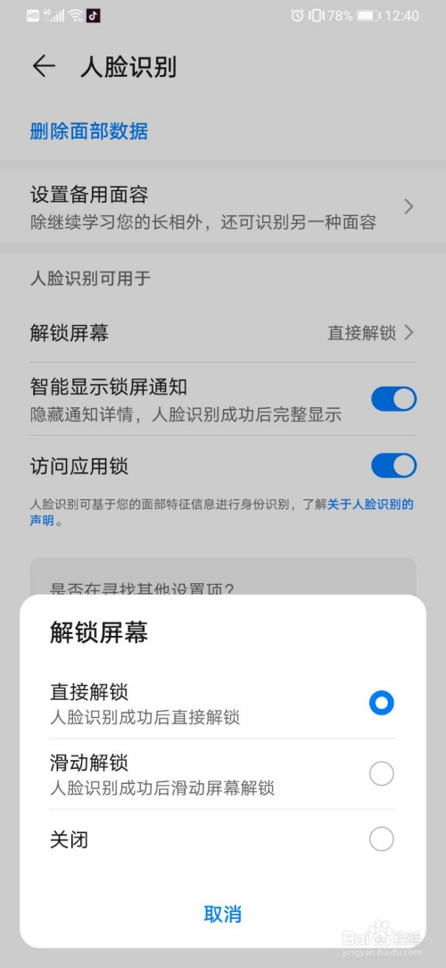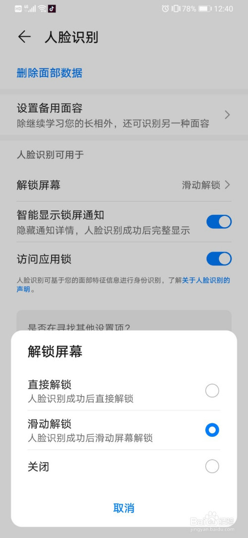 然后返回上一个界面,点击人脸识别进入,这里会有一个解锁屏幕,点击进入到该菜单傍边。