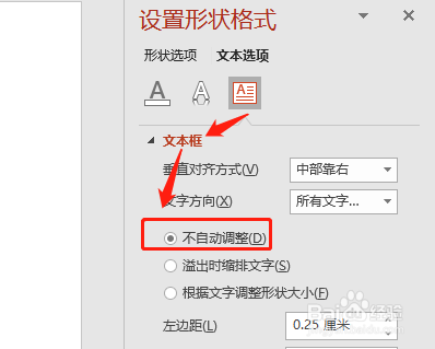 2.在“文本框”功能的“文字偏向”下,点击选择“不主动调整”选项即可。