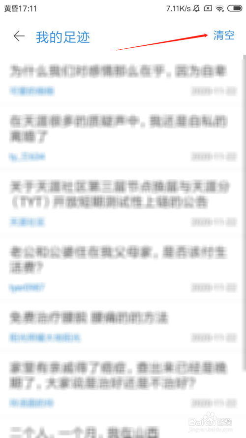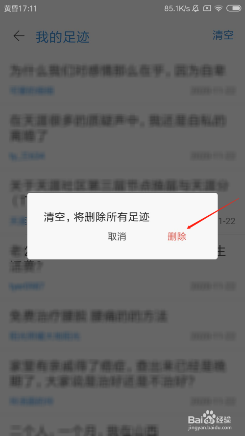 在我的萍踪页面里,点击右上角的清空按钮。