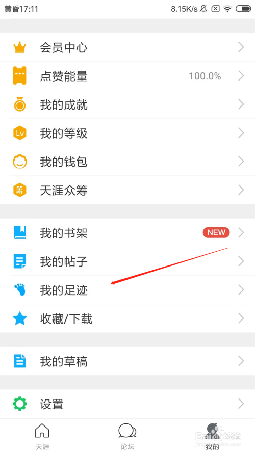 在小我中间页面里,点击我的萍踪选项。