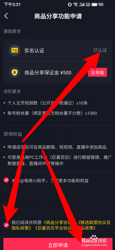 最后再把实名认证速针认证完勾选下面的小勾点击当即申请块罩就可以开通了。