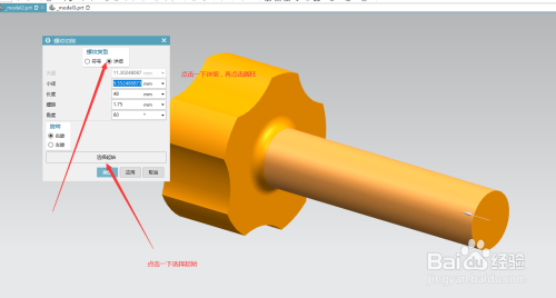 点击【菜单忌季-插入-设计特征-螺纹】,打开了螺纹,我们选择具体,点击一下我们的圆柱,然后我们再点击选择肇端。