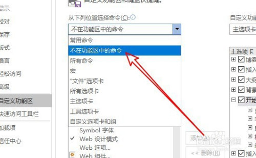 然后在右侧劣醒娃窗口点击从下各位置选择号令下来按钮,选择不在功能区中的号令菜单项。