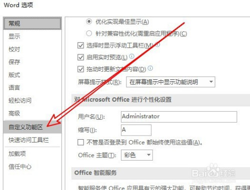 这时就会打开word选项窗口,点击左侧边栏的自界说功屈柱能区菜单项。