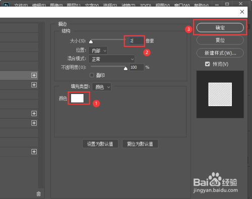 接下来,我们把描边设置为白色,大小为2像素,点击【确定】,如图所示杰牺。