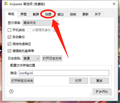 在“Snipaste 首选项”界面中,点击上方的“贴图”选项。