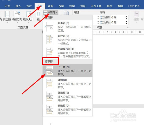 打开word文档,鼠标定位到第一页末从头至尾处,然后点击“结构”——“分隔符”——分节符——下一页。