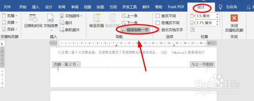 然后双击打开第二页页脚,在“设计”栏下面,点击“链接到前一节”,打消2个节之间的链接。