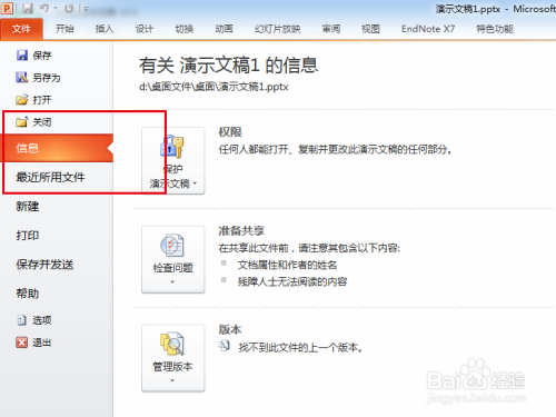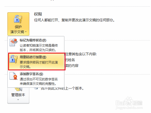 点击【权限】屈袭宋下的劣新【庇护演示文档】,并选择【用密码进行加密】;