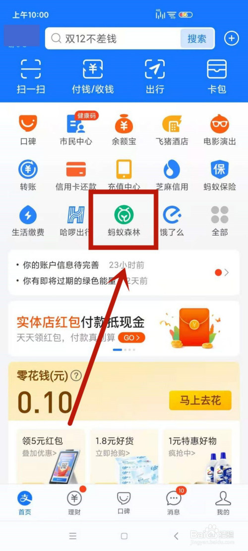 1.打开支付宝,点击蚂蚁丛林。