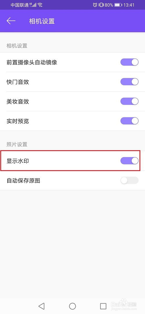第五步进去相机设置之后,点击开启显示水印,就设置美妆裕压相机水印了,按照需要设置