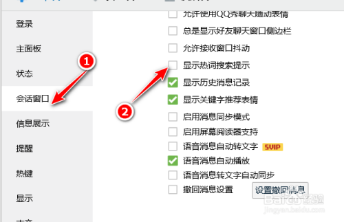 点击会各攀话窗口,如图冲瞧打消勾选良调袭显示热词搜刮提醒即可