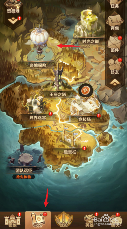 打开剑与远征游戏后,点击下方的野外选项,选择奇境探险的图标。