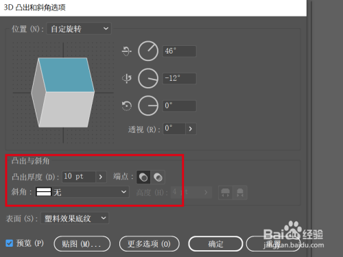 在【3D凸出和斜角】窗口里设置合适的斜角量,并调整合适的角度;