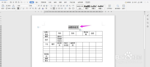 在表格上面输入“应聘申请书”字体加粗、居中、调大,这样表格就建造完当作了