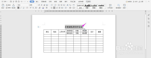 在表格上面输入“在职练习费用申请表”字体加粗、居中、调大,这样表格就建造完当作了