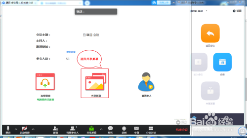 进入会议后,如下图所示我们选择共享屏幕选项,将会进入到我们电脑自己的界面;