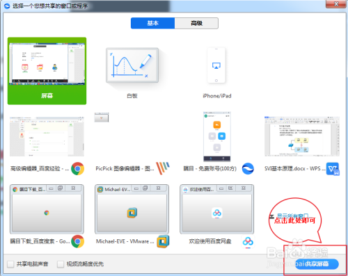 进入共享界面,如下图所示 我们可以选择某一个界面来共享(单选某一个即可),也可以将整个电脑的界面都共享出来的,我们此处选择所有;