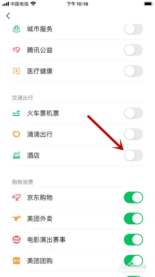 跳转新页面后,查找并点击【酒店】右侧按钮,按钮变暗就当作功埋没了。