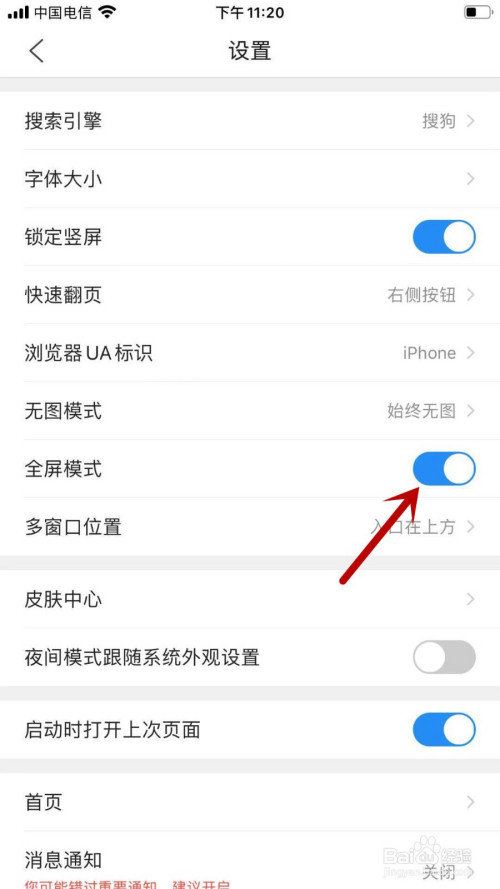 跳转新页面后,查找并点击【全屏模式】右侧按钮。