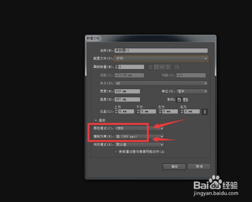 最后设置颜色模式和分辩率,打印是CMYK,分辩率按照尺寸设置,点击确定即可。